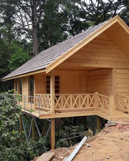 This project showcases various elevated wooden structures, including cabins and houses, set in natural surroundings. The designs feature unique architectural elements such as stilts, metal supports, and wraparound porches.